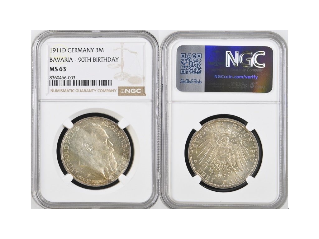 3 MARKA 1911 D OTTO (1886-1913) BAVORSKO (BAYERN), certifikace NGC