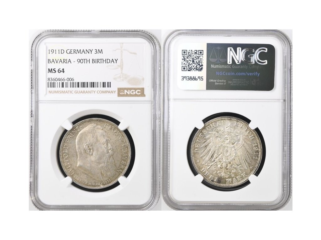 3 MARKA 1911 D OTTO (1886-1913) BAVORSKO (BAYERN), certifikace NGC