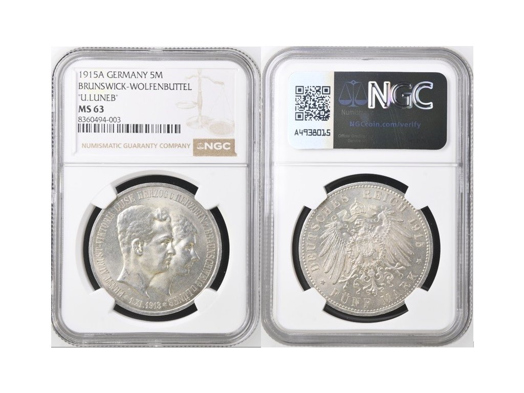 5 MARKA 1915 A Ernst August (1913-1918) BRUNSWICK-WOLFENBUTTEL, certifikace NGC