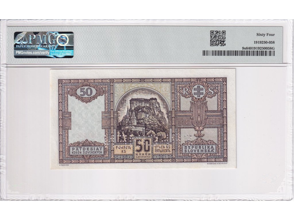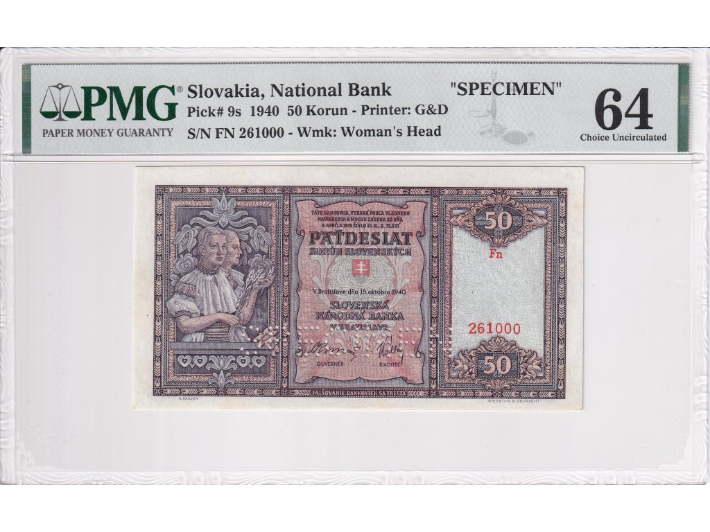 50 Ks 1940 SPECIMEN (v dolní části bankovky), certifikace PMG