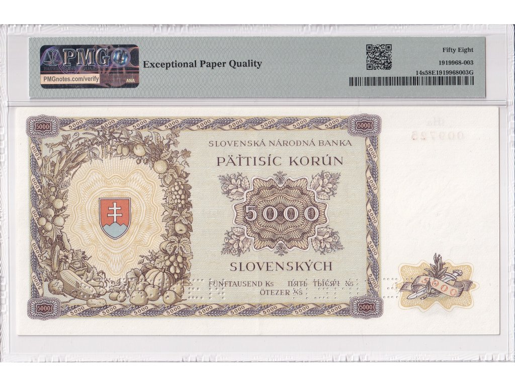 5000 Ks nevydaná 1944 2x SPECIMEN (v dolní části bankovky), certifikace PMG