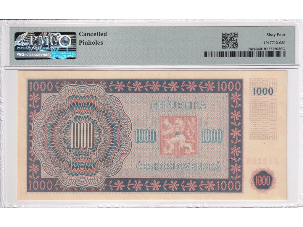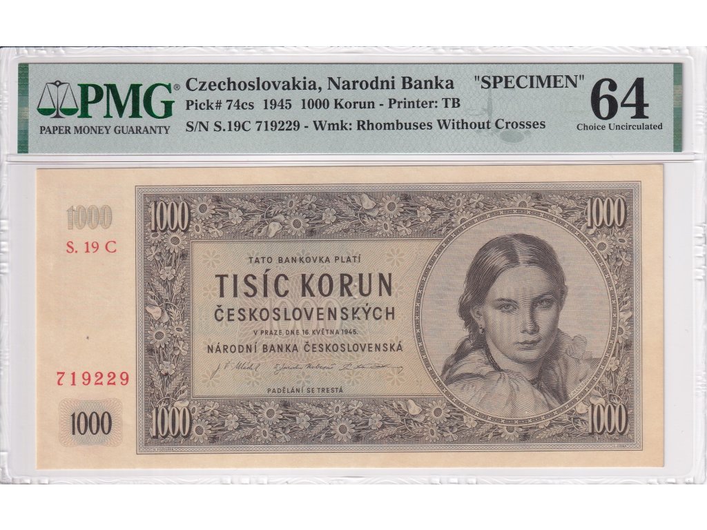 1000 Kčs 1945 SPECIMEN (in the middle of the banknote), PMG Certification
