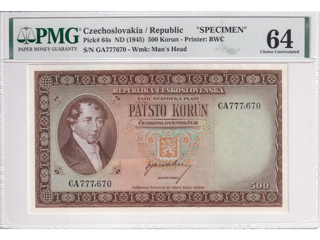 500 Kčs 1945 SPECIMEN (ve střední části bankovky), PMG Certification