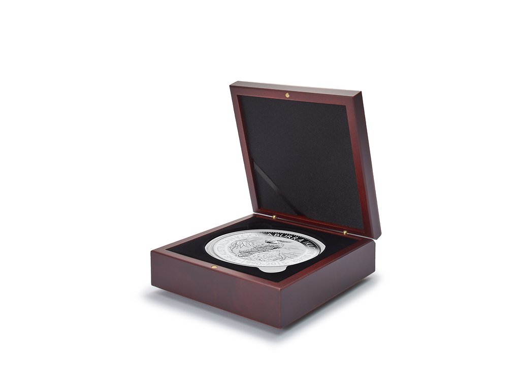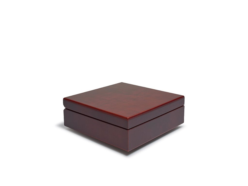 Kazeta VOLTERRA v barvě mahagonového dřeva. Víko polstrováno látkou ve vzhledu černého saténu, se saténovou stužkou pro vložení certifikátu nebo osobní zprávy, spodní část polstrována látkou ve vzhledu černého veluru, s otvorem 111,5 mm.